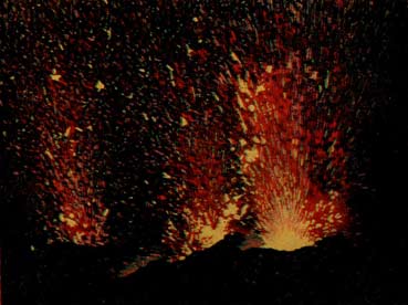 В отличие от большинства вулканов в кратере Стромболи, в сущности, почти нет никакой полости: столь интенсивна работа этого вулкана, который непрерывно заполняет свой кратер грудами застывшей лавы, что он превратился в подобие неровной террасы, кое-где прорезанной багровыми жерлами, то тихо дымящимися, то издающими грозный рев. И, погружаясь в кратер, люди на самом деле спускаются с вершины древней горы на террасу нового действующего вулкана.