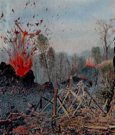 Я наконец увидел тот таран, от ударов которого сотрясалась земля на площади 10 000 квадратных метров. Это была лава. Разбрасывая искры, она тяжело билась о стенки огненного колодца; меня качало и трясло, как тростинку, которую треплет буря.