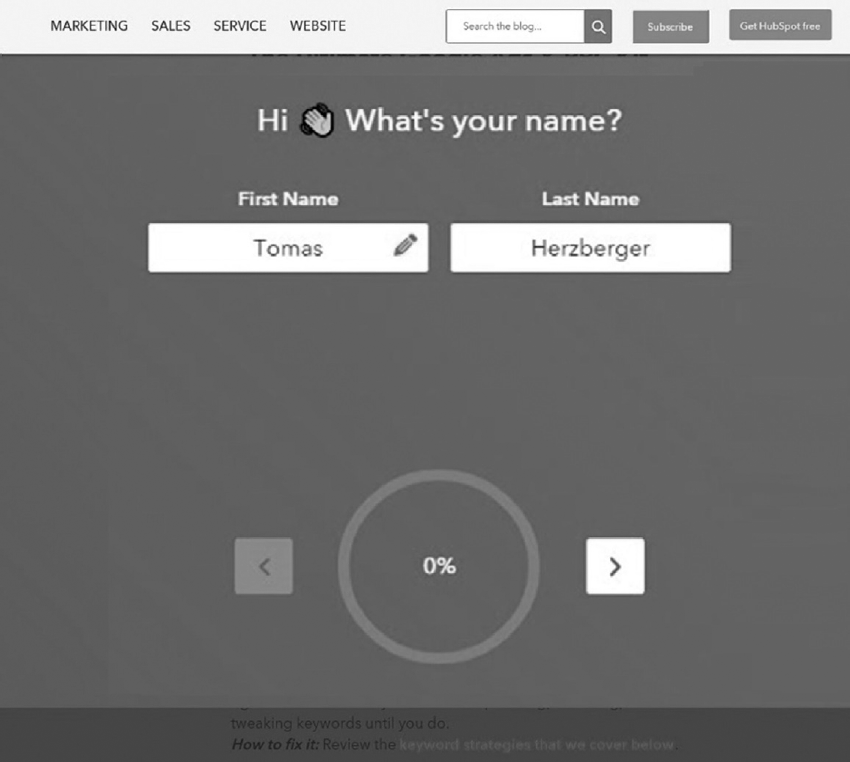 Ein Alternative zu den bekannten, untereinander stehenden Textfeldern ist die Aufteilung eines Formulars auf mehrere Seiten, wie es beispielsweise HubSpot testet (Abbildung 7).