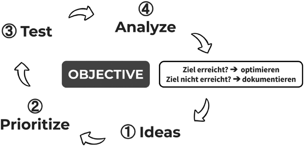 3.Die entstandenen Ideen werden priorisiert. Denn Quantität und Geschwindigkeit der Tests sind wichtig, aber Aktionismus soll trotzdem vermieden werden. Deswegen muss gut überlegt werden, mit welcher Idee man startet. Für die Priorisierung stehen mehrere Scoring-Modelle zur Verfügung, wie beispielsweise ICE, BRASS oder PIE.