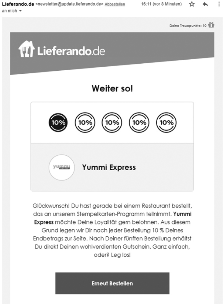 Besonders wichtig: der Ladebalken unter den Formularfeldern. Denn wir Menschen lieben Dinge, die vollständig sind. Daher sind wir unterbewusst bestrebt, den Ladebalken auf 100 Prozent zu bringen (und damit das Formular vollständig auszufüllen). Diese Mechanik machen sich auch viele Onlineunternehmen im Rahmen ihres Onboarding-Prozesses zunutze. Das Business Network LinkedIn motiviert auf diese Weise seine Kunden, ihr Profil vollständig auszufüllen und der Lieferdienst Lieferando, schnell die nächste Bestellung aufzugeben (Abbildung 8 und 9).