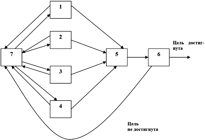 Например, по ветвям (1,3), (2,3), (3,4) возможен такой обмен информацией при нахождении методов достижения цели: информация о выбранной цели, ресурсах и ограничениях используется в вершине 3 графа для нахождения методов; какой-либо вариант метода вносит корректировку в формулировку цели, требует коррекции ограничений и ресурсов и т.д. Подробные циклические обмены совершаются и при осуществлении этапа 7.