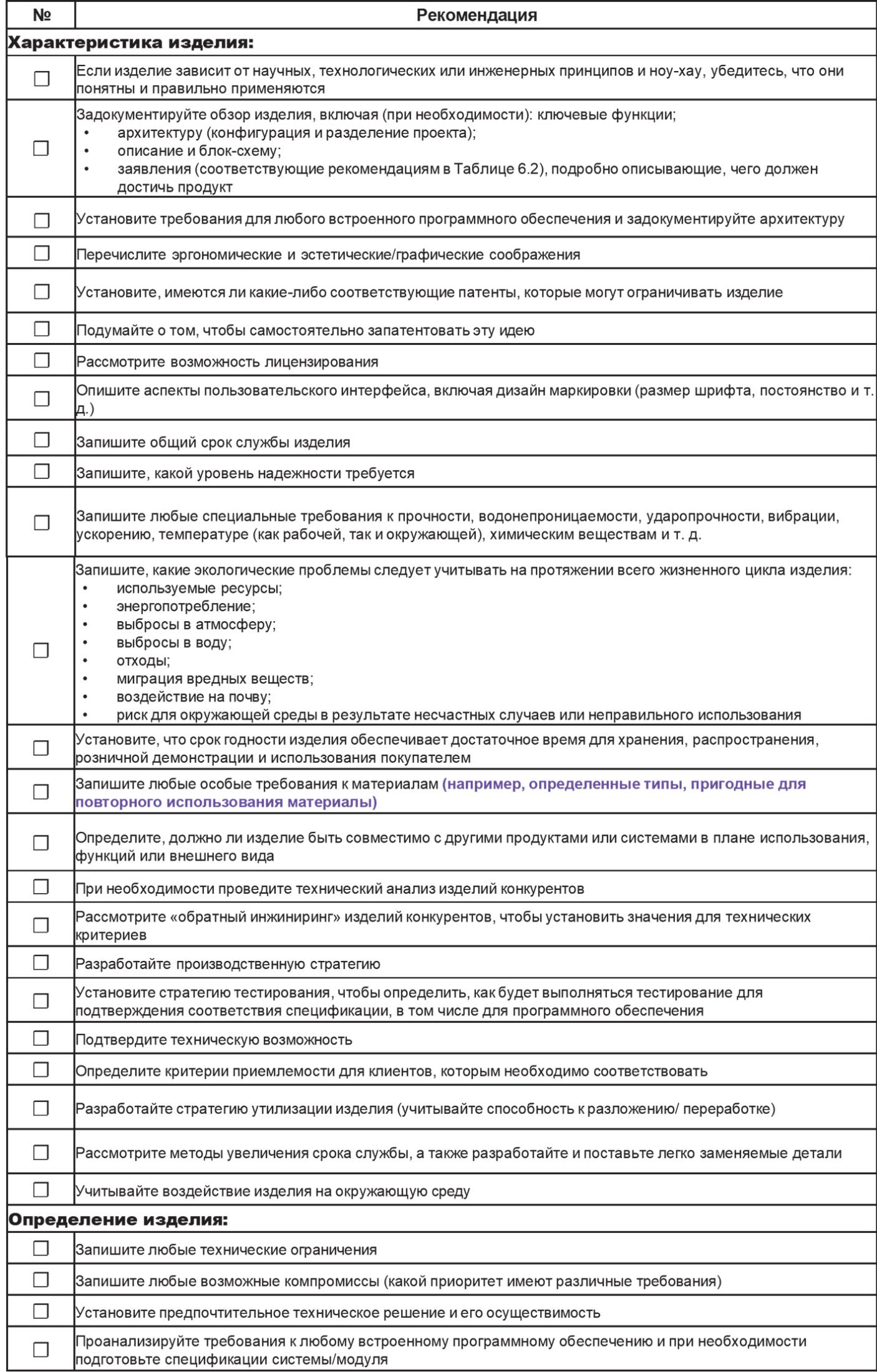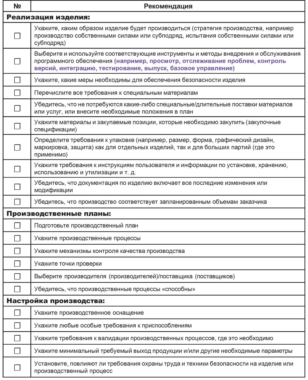 Таблица 6.5 – Контрольный список рекомендаций для использования при рассмотрении вопроса о том, как производить изделие