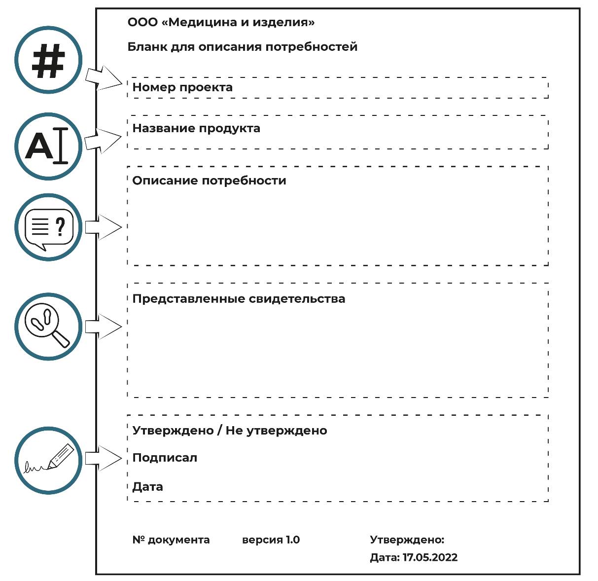 На рисунке 4.3 приведен пример утвержденного бланка заявления о потребности. Он не является образцом для прямого копирования, но является основой для разработки собственного документа. Это контролируемый документ, поэтому он имеет уникальное имя, версию и официальное утверждение. Он должен быть размещен в руководстве по качеству компании. Название продукта не обязательно должно быть окончательным, которое продукт сохранит навсегда.