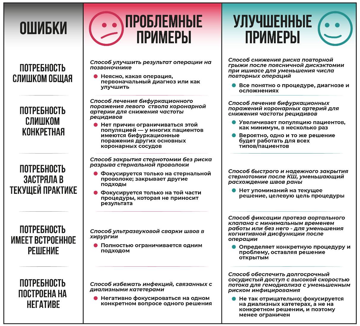 Рассмотрим, как построен процесс определение потребностей в инновационном процессе биодизайна (Stanford Biodesign), который основан на убеждении, что инновации – это процесс, который можно изучить, практиковать и совершенствовать. Согласно этому подходу, хорошо построенные формулировки потребностей состоят из трех основных компонентов: (1) проблема, (2) целевая группа и (3) целевой результат.