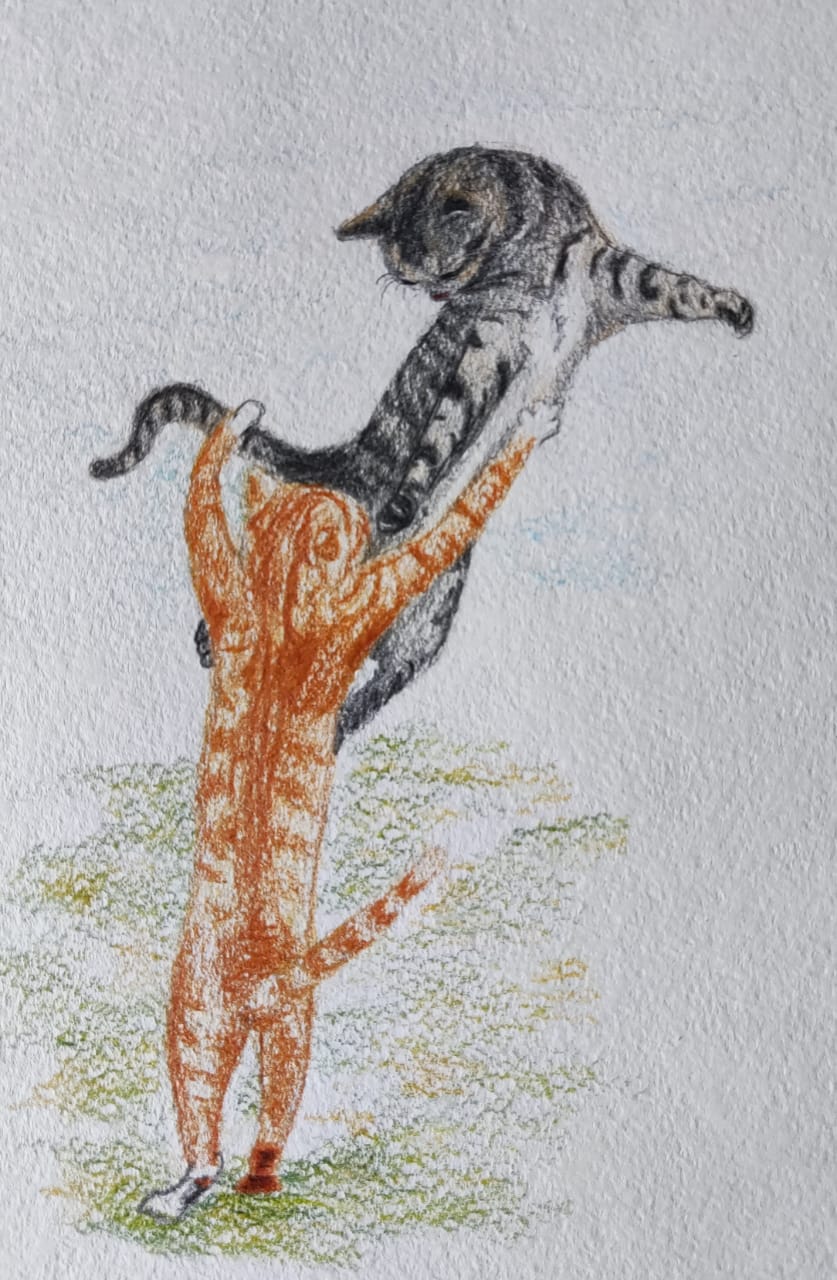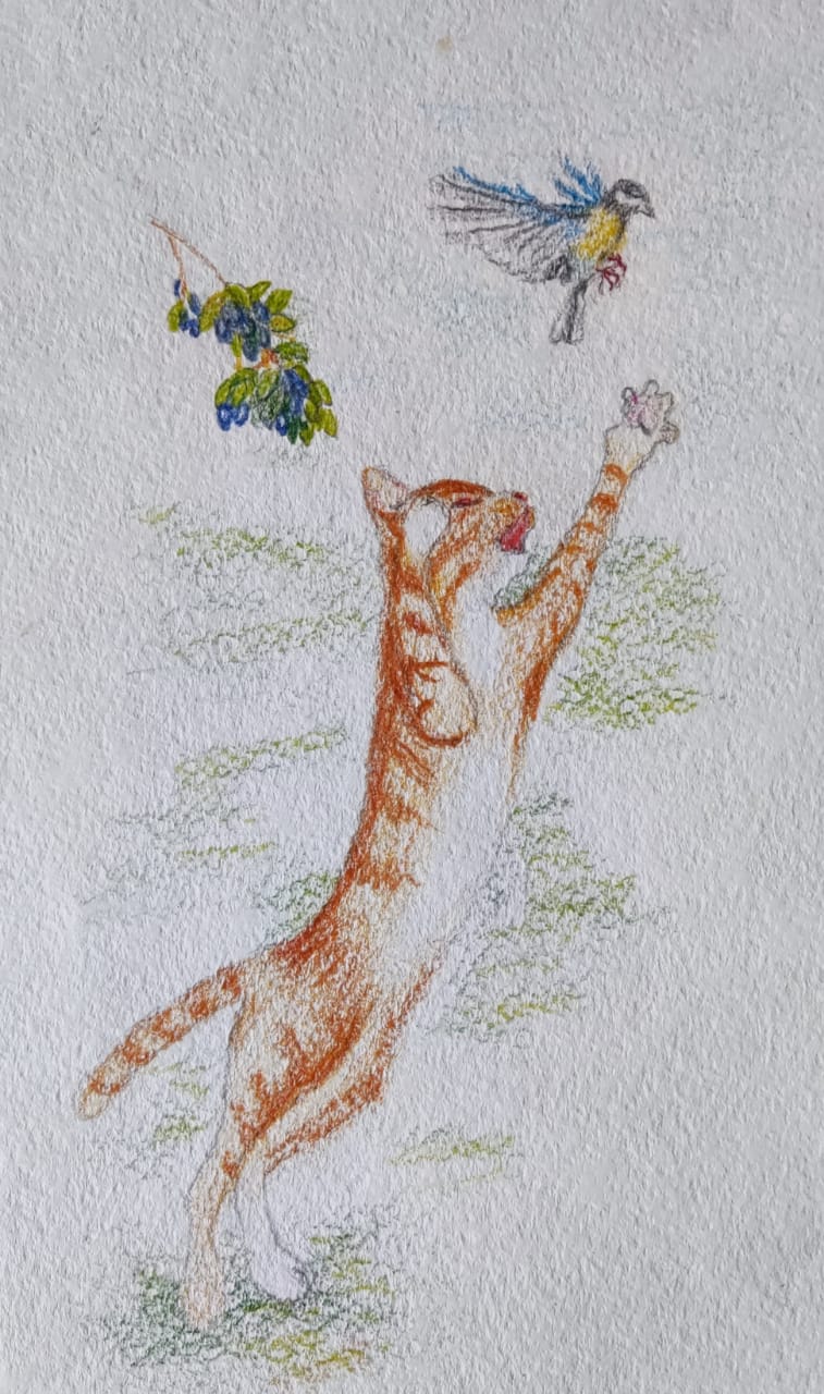 Я решил обойти свою территорию, я впервые шёл по траве, такой влажной и прохладной. Я обнаружил на заднем дворике дома сливу, на ветках которой пели синички. Тогда я понял, что я должен схватить одну из них, как тряпку в детстве. Но я ни разу в жизни не охотился за живым, разумным существом. Ну выбора у меня не было, и я направился к дереву. Когда я оказался у ствола, я понял, что забраться на дерево и порхать за птичками с ветки на ветку не лучший вариант, нет, раньше мне бы это может и понравилось, но не сейчас. Тогда я сел под самой низкой веткой и начал ждать, когда на неё сядет птичка. Но мне жутко не везло, птички уже раз десять садились на ветки, но как только я готовился к прыжку, они перелетали на другую ветку, как бы дразня меня: «не поймаешь, не поймаешь». Тогда я жутко разозлился и почувствовал в себе переизбыток злобы. Я не знал куда её девать, она сидела и множилась во мне, каждую секунду её становилось всё больше и больше. Я чувствовал, как моё тело наливается свинцом. Тогда я не выдержал, выскочил из-под забора и помчался что было духу по прямой вдоль дороги. Я впервые бежал так быстро, я не смотрел по сторонам, меня не интересовала больше, что я там увижу. Вскоре изо рта у меня хлынула пена и я начал задыхаться. Но неет, злоба во мне ещё не кончилась, тогда я повернул обратно и помчался по своим следам к моей территории. Когда я туда добежал, я был ни жив ни мёртв. Я был весь взмыленный и упал на траву. Так я пролежал до полудня и набравшись сил ко мне вернулась и моя злоба. Я направился к сливе, сел под ту же ветку и… и… я собрал всю, всю свою злобу, все, все свои силы, припомнил себе тот, тот страшный голод, который так нещадно сверлил меня и прыгнул, выпустил когти и схватил птичку. Я убил её и съел со зверством в движениях, с огнём в глазах и с болью в сердце. Покончив с ней мне полегчало. Тогда я решил опять просто полежать, да, да, вы не ослышались, просто полежать. Мне не было больше дела до каких-либо дел. Я посмотрел на птиц, которые в испуге уселись на верхние ветки дерева и больше не порхали. Мне это понравилось, поэтому я лёг прямо под сливой на спину и начал наблюдать за синичками, а когда одна из них опускалась на веточку ниже, я резко поднимал лапу вверх, и она возвращалась обратно. Таким образом, я придумал себе игру, которая меня забавляла ещё долгое время, но всему когда-то приходит конец.