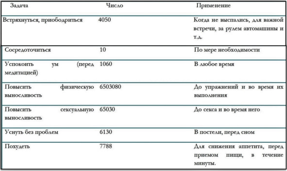 – Произносите мысленно числа для медитации (см. таблицу чисел).