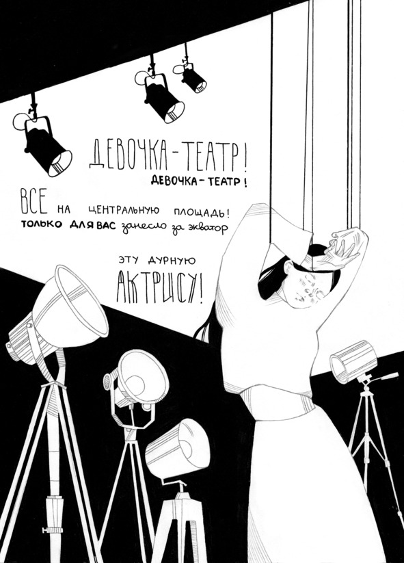 Девочка-театр! Девочка-театр! Все на центральную площадь! Только для вас занесло за экватор эту дурную актрису!Девочка-театр! Девочка-театр! Боже, что может быть проще! Просто идите, просто бегите, пяльтесь, откинув кулисы!Да, это просто. Да, это просто. Девочка-театр не против. Девочка-театр давно не невинна, знает она всё, умеет.Эти подмостки, эти подмостки в грязной грешной позолоте День ото дня, за́ годом год, каждый, кто хочет, имеет.– Как же случилось? Как же случилось? Девочка, ты же прекрасна! В тёмных желаниях этих людишек ты же ничуть не виновна!– Дядя, уйдите! Или… берите! Буду для вас не опасна. Видите, дядя? Я же мертва! Видите? Тело бескровно.