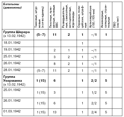 Примечание: истребительно-противотанковые части и подразделения не учитываются вследствие придания их пехотным подразделениям. Некоторые подразделения (остатки войск, части охранных соединений) учитываются как один батальон (дивизион). Артиллерийские и саперные подразделения группы Шерера находились вне кольца. Силы ПВО указаны только в общем количестве, так как они были дислоцированы на больших по площади участках.