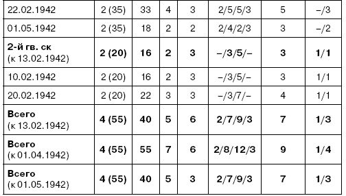 Примечание: истребительно-противотанковые части и подразделения не учитываются вследствие придания их стрелковым подразделениям. Разведывательная рота дивизии и роты автоматчиков в полках считаются за один разведывательный батальон. По артиллерии необходимо учитывать, что советский дивизион имел 6–8 орудий, а немецкий – 12.