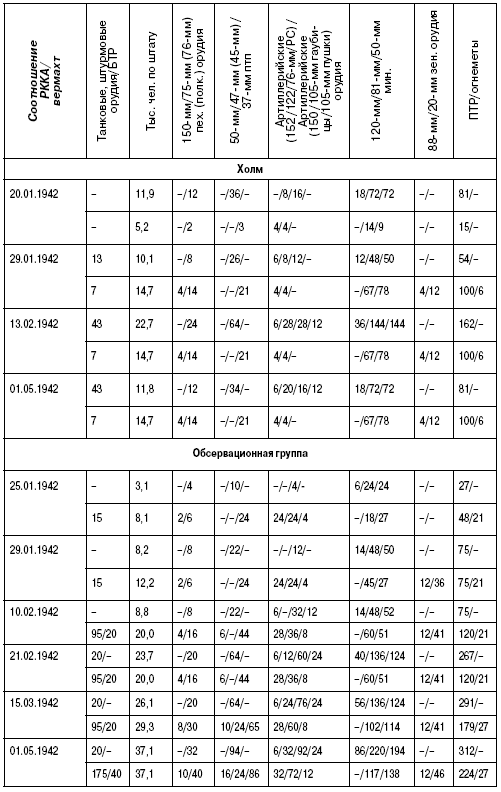 – по пехоте необходимо учитывать, что численность личного состава советского батальона была в 1,5 раза меньше, чем в немецком. В советских батальонах отсутствовали минометы. Минометы пехотных батальонов и оружие рот тяжелого оружия вермахта компенсировались минометными дивизионами (батальонами) полков, бригад, дивизий и полковыми пушками. По количеству противотанковых пушек усиленный немецкий пехотный батальон был в два раза сильнее усиленного стрелкового советского. Это в определенной степени компенсировано наличием 171-го противотанкового полка в Холмской группе;