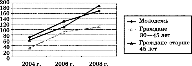 10. На графике показано изменение уровня безработицы среди различных групп населения страны Z в 2004–2008 гг.