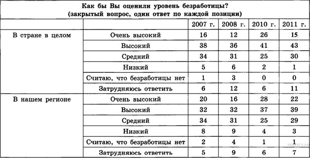 7. В течение ряда лет проводились исследования по выявлению оценки россиянами уровня безработицы. Полученные данные представлены в таблице. Сформулируйте вывод по данному факту и сделайте два предположения, как может совершенствоваться политика государства по данному вопросу.