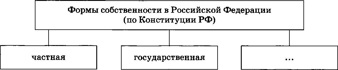 Закон различает частную, государственную, муниципальную и иные формы собственности (ст. 8 Конституции РФ; ст. 212 ГК РФ). На праве частной собственности имущество может принадлежать гражданам либо юридическим лицам. Некоторые виды имущества не могут находиться в частной собственности (например, объекты оборонного производства, государственная казна, ресурсы континентального шельфа). На праве государственной собственности имущество может принадлежать либо Российской Федерации, либо субъектам Российской Федерации; на праве муниципальной собственности имущество принадлежит муниципальным образованиям.