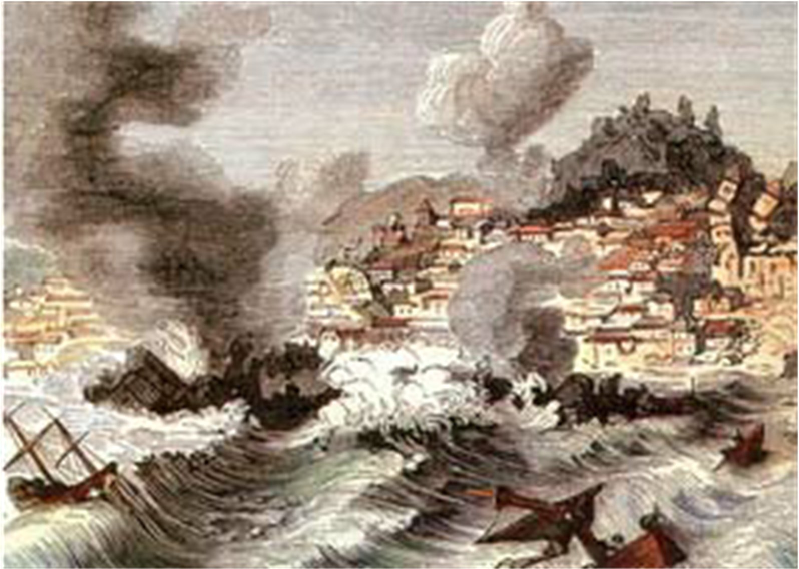 Однако шествие не состоялось. В 9 ч 20 мин город содрогнулся, высокие шпили церквей «закачались, словно колосья на ветру». Не успела земля успокоиться, не прошло и несколько секунд, как последовал второй, еще более мощный толчок: колокольни рухнули на крыши храмов, стены домов разваливались, погребая под собой сотни и тысячи идущих по улицам людей. Те, кому удалось спастись из этого ада, устремлялись к берегам р. Тахо и портовым причалам, надеясь найти там спасение. Но после первого толчка воды реки отступили, обнажилась вся акватория порта и стоявшие у причалов корабли завалились набок на илистом дне. Вода тут же вернулась: высокие, как дом, бурлящие валы неистово обрушились на город, швыряя на берег тяжелогруженые трехмачтовые суда, как игрушечные кораблики. Вскоре волны докатились до центра города, затопили лабиринт узких улочек – они мгновенно превратились в стремительные потоки, поглотившие все, что встречалось им на пути (рис. 2.2).