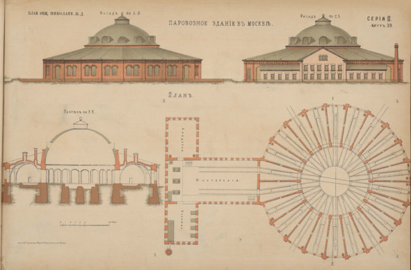 Паровозное здание в Москве. Альбом чертежей сооружений Российских железных дорог, 1872 г.