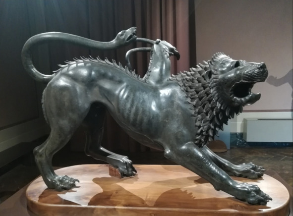 Из бронзы этрусские скульпторы отливали статуи и статуэтки для украшения храмов, жрецы использовали некоторые из них для ритуальных обрядов. Самые известными являются: Химера из Ареццо, Миневра и Оратор. Сейчас эти статуи находятся в археологическом музее Флоренции, а когда-то они были частью коллекции династии Медичи. Химера – мифологическое существо с туловищем и головой льва, посередине его хребта находится коза, а его хвост – это змея. Существо совершенно нереальное, поэтому слово «химера» стало нарицательным и олицетворяет что-то невозможное. Химера, по мифологии, является порождением свирепого, огнедышащего великана Тифона и женщины—змеи по имени: Ехидна. От них же родились: Немейский лев, трехглавый пёс Цербер, Колхидский дракон, Лернейская гидра и другие мифологическое чудовища.