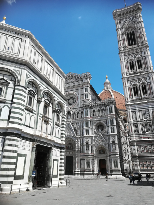 Инна потихоньку изучала Флоренцию и город ей ужасно нравился. У девушки просто челюсть отвисла, когда она впервые увидела кафедральный собор Санта Мария дель Фьоре. Тогда был пасмурный и дождливый день, небо окрасилось в темно-серый цвет, все вокруг казалось каким-то мрачным. Инна заранее договорилась встретиться с Викой на станции и они вместе пошли по направлению к храму. Вдруг из этой черноты выступило бело-розово-зеленое чудо какой-то неземной красоты! Девушки пришли в неописуемый восторг! Они обошли со всех сторон огромное здание, вошли внутрь, в будний день мессы не было.