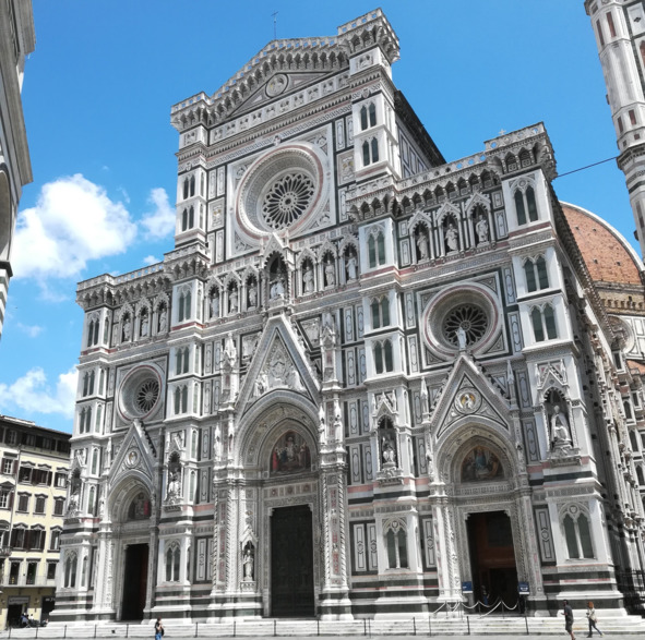 Потом Карина с Ярославом отправились на экскурсию с Ириной, во время которой они долго гуляли по центру города. Собор Санта Мария дель Фьоре привел всех в восторг: сочетание стиля готики и разноцветного мрамора – белого, розового и зеленого было невероятно красиво. На фасаде собора оказалось множество статуй и бюстов святых, апостолов, Мадонны с младенцем и цветком в руке – это было название собора: Санта Мария дель Фьоре, Святая Дева Мария с цветком. На самом верху были бюсты Филиппо Брунеллески, Арнольфо ди Камбио, Микеланджело, Андреа Пизано, Франческо Петрарки, Данте Алигьери, Леонардо да Винчи, Рафаэля Санти, Джотто и многих других персонажей. Вокруг круглого окна с цветным витражом оказались бюсты Америго Веспуччи, Галилео Галилея и географа Паоло ди Поццо Тосканелли, который, как рассказала Ирина, раньше Колумба предположил, что надо плыть на запад чтобы найти новый путь в Индию.