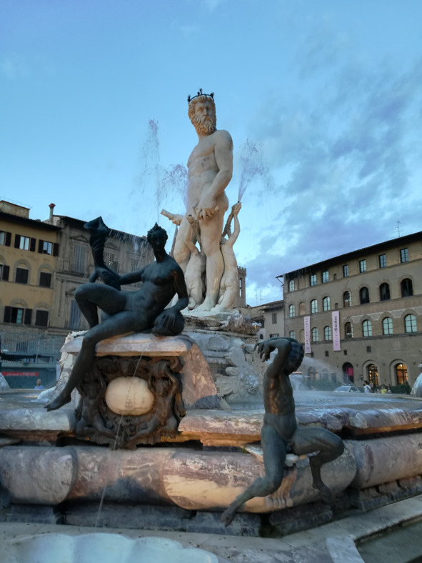 Дальше по ходу экскурсии была площадь Синьории с Палаццо Веккио – второй резиденцией Медичи, куда они переехали, когда получили герцогский титул. Этот дворец стал особенно популярен после выхода романа Дэна Брауна: «Инферно». На площади Синьории перед дворцом было много статуй, среди которых выделялся фонтан Нептун с огромной белоснежной статуей божества.