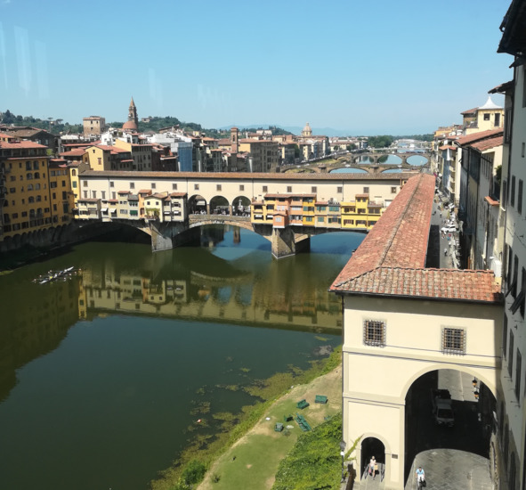 Затем они перешли через Старый мост с ювелирными магазинами на другую сторону реки Арно и гид рассказала им историю о том, как на мосту появились мясные ряды, и как они потом сменились на ювелирные лавки. Карину и Ярослава заинтересовала конструкция коридор Вазари, который тянется через галерею Уффици и Старый мост и соединяет два дворца Медичи.