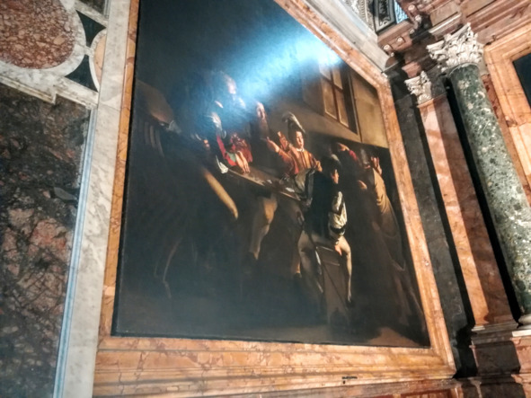Затем подруги пошли в церковь Сан Луиджи дельи Франчези, которая была посвящена королю Франции Людовику IX Святому. Её строительство начал кардинал Джулио Медичи, будущий папа Климент VII. А после смерти папы эту работу продолжила его внучатая племянница Екатерина Медичи со своим мужем французским королем Генрихом II. Они и посвятили её Людовику Святому. Внутри базилика оказалась красиво украшена в XVIII веке в стиле позднего барокко разноцветным мрамором, позолоченными рельефами и росписями на тему: «Слава Людовика IX Святого». Но самое главное, что подруги хотели увидеть внутри – это капелла семьи Контарелли с тремя полотнами художника Микеланджело Меризи, по прозвищу Караваджо: «Призвание апостола Матфея», «Святой Матфей и ангел» и «Мученичество Святого Матфея». Сцены были написаны на очень темном фоне. На первой картине было изображено открытое окно, откуда падал солнечный свет и освещал стол, за которым сидело несколько мужчин. Под окном в темноте стоял Иисус, он протянул руку и указывал пальцем на бородатого человека с беретом на голове – Левия Матфея. Тот удивленно показывал ладонью на себя и указательным пальцем на сидящего рядом, как бы спрашивая: «Я, или он?»
