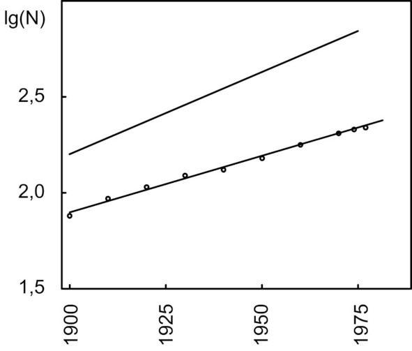 Рис. 2.2. Зависимость численности населения CCCP от времени. По вертикальной оси отложен десятичный логарифм численности населения N (в миллионах человек); по горизонтальной оси – время в годах. Верхняя прямая линия – демографическая модель с четырьмя детьми в семье. Пунктирная прямая линия – демографическая модель с тремя детьми в семье.