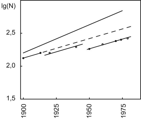 Второй разрыв сплошной прямой линии соответствует резкому уменьшению численности населения во время второй мировой войны. Послевоенный период (третий отрезок прямой) опять достаточно точно соответствует рассмотренной ранее теоретической демографической модели с тремя детьми в семье.