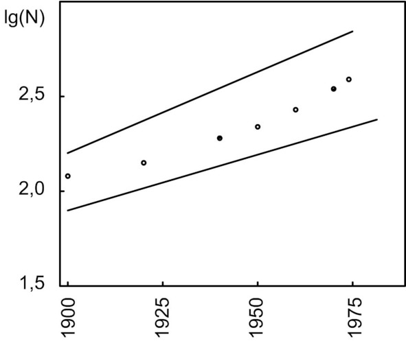 Точки на графике соответствуют официальным статистическим данным (данные переписи населения), прямая линия – описанная ранее теоретическая зависимость. Видно, что рост населения хорошо описывается рассмотренной ранее демографической моделью с тремя детьми в семье.