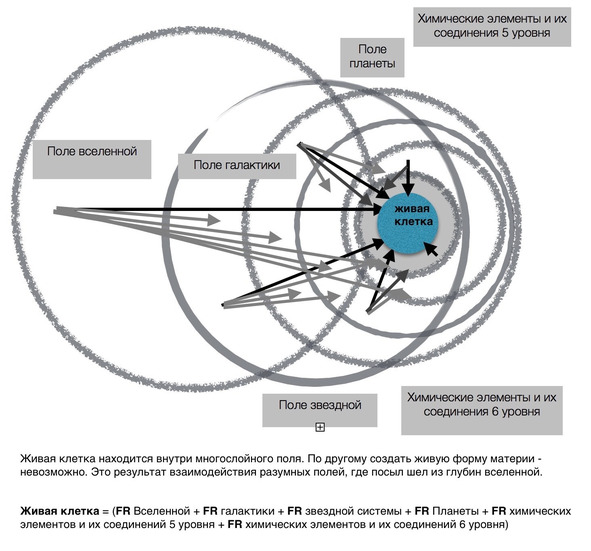 Чуть более одного миллиарда лет назад, на поверхности планеты Земля, родилась живая клетка. Благодаря механизму клонирования и течению энергии разума по каналам химических элементов шестого уровня, была воссоздана точная копия вселенной: – живая клетка, которая несла в своем строении генетический код существования самой вселенной! «Дыханье жизни», которое было инициировано соответствующим потоком энергии разума, проникало через эфир и материю, создавая новую форму материи, новую физическую оболочку, новое ядро и новое поле, внутри которых закружились в страстном танце две силы мироздания – сила природы (Fp) и сила разума (Fr).