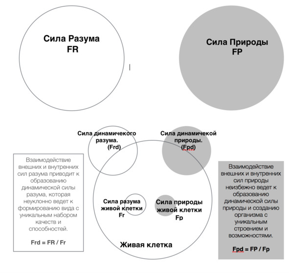 А до тех пор, пока этот вид не появился, взаимодействие внешних и внутренних сил внутри живой клетки, приводит к тому, что на границе ее физической оболочки образовываются динамическая силы природы (Fpd) и динамическая силы разума (Frd). Действия этих сил приводят к изменению формы и содержания живой клетки, а далее и живых организмов. Отчасти, сила динамического разума, это результат взаимодействия внешней силы разума (FR) и внутренней силы разума (Fr), который приводит к образованию нового набора качеств и способностей. Новые качества и способности неизбежно расширяют функции всех новых видов и всех форм жизни.