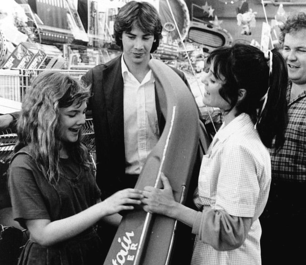Киану Ривз и Дрю Бэрримор на съемках фильма «Путешествие в сказку». 1986 г.
