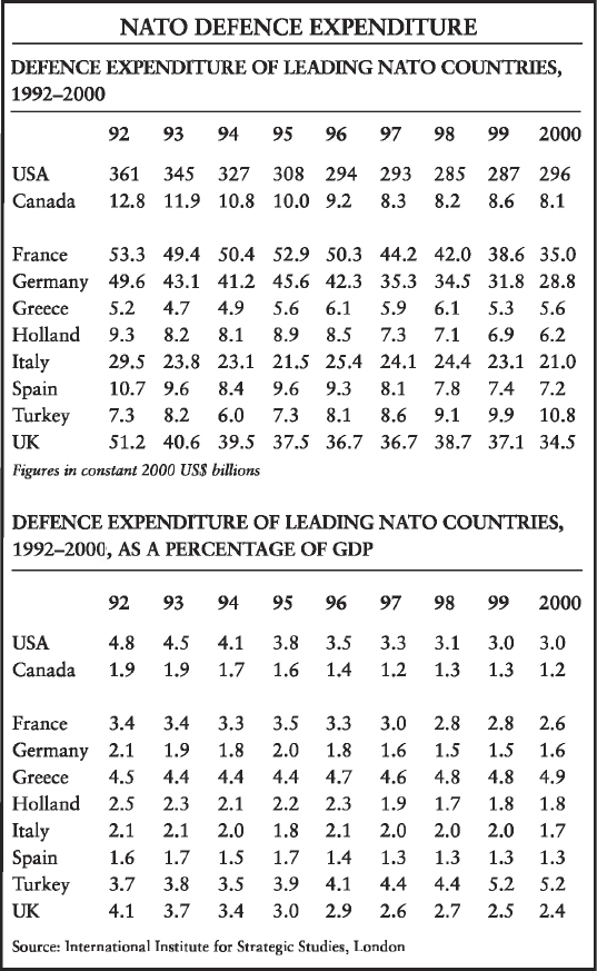 This steep decline in US military spending was more than mirrored elsewhere in NATO. Germany, Spain and Italy spend less than 2 per cent of their GDP on defence, while America spends 3 per cent. Put another way, the United States spent $296 billion on defence in 2000, compared with the European NATO members’ total contribution of just $166 billion. The Europeans have cut defence by 22 per cent in real terms since 1992, and they are still cutting.