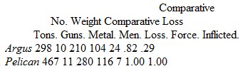 or, subtracting as usual 7 per cent. for light weight of metal, 210 lbs. The Pelican's crew consisted of but 116 men, according to the British account, though the American reports make it much larger. The Argus had started from New York with 137 men, but having manned and sent in several prizes, her crew amounted, as near as can be ascertained, to 104. Mr. Low in his "Naval History," published just after the event, makes it but 99. James makes it 121; as he placed the crew of the Enterprise at 125, when it was really 102; that of the Hornet at 162, instead of 135; of the Peacock at 185, instead of 166; of the Nautilus at 106 instead of 95, etc., etc., it is safe to presume that he has overestimated it by at least 20, which brings the number pretty near to the American accounts. The Pelican lost but two men killed and five wounded. Captain Maples had a narrow escape, a spent grape-shot striking him in the chest with some force, and then falling on the deck. One shot had passed through the boatswain's and one through the carpenter's cabin; her sides were filled with grape-shot, and her rigging and sails much injured; her foremast, main-top-mast, and royal masts were slightly wounded, and two of her carronades dismounted.