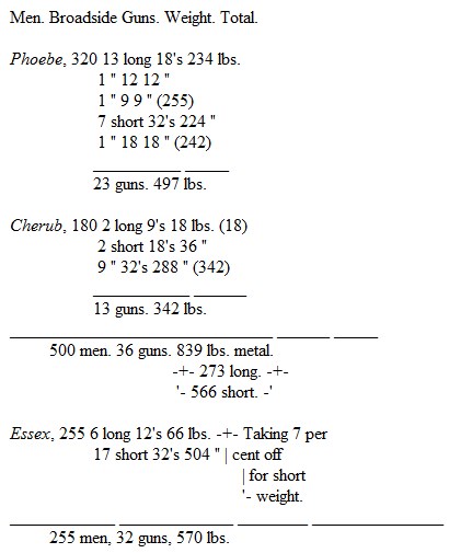 After the fight Hilyar behaved most kindly and courteously to the prisoners; and, as already said, he fought his ship most ably, for it would have been quixotic to a degree to forego his advantages. But previous to the battle his conduct had been over-cautious. It was to be expected that the Essex would make her escape as soon as practicable, and so he should have used every effort to bring her to action. Instead of this he always declined the fight when alone; and he owed his ultimate success to the fact that the Essex instead of escaping, as she could several times have done, stayed, hoping to bring the Phoebe to action single-handed. It must be remembered that the Essex was almost as weak compared to the Phoebe, as the Cherub was compared to the Essex. The latter was just about midway between the British ships, as may be seen by the following comparison. In the action the Essex fought all six of her long 12's, and the Cherub both her long 9's, instead of the corresponding broadside carronades which the ships regularly used. This gives the Essex a better armament than she would have had fighting her guns as they were regularly used; but it can be seen how great the inequality still was. It must also be kept in mind, that while in the battles between the American 44's and British 38's, the short weight 24-pounders of the former had in reality no greater range or accuracy than the full weight 18's of their opponents, in this case the Phoebe's full weight 18's had a very much greater range and accuracy than the short weight 12's of the Essex.