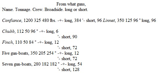 In all, 16 vessels, of about 2,402 tons, with 937 men, [Footnote: About; there were probably more rather than less.] and a total of 92 guns, throwing at a broadside 1,192 lbs., 660 from long and 532 from short pieces.