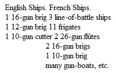 During the same time the English lost to the Danes one 14-gun brig, and destroyed in return a frigate of 46 guns, a 6-gun schooner, a 4-gun cutter, two galliots and several gun-brigs.