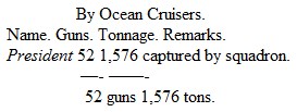 I have excluded from the British loss the brigs Detroit and Caledonia, and schooner Nancy (aggregating 10 guns and about 500 tons), destroyed on the upper lakes, because I hardly know whether they could be considered national vessels; the schooner Highflyer, of 8 guns, 40 men, and 209 tons, taken by Rodgers, because she seems to have been merely a tender; and the Dominica, 15, of 77 men, and 270 tons, because her captor, the privateer Decatur, though nominally an American, was really a French vessel. Of course both tables are only approximately exact; but at any rate the balance of damage and loss was over 4 to 3 in our favor.] but the loss of the revenue-cutters and gun-boats can fairly be considered to be counterbalanced by the capture or destruction of the various British Royal Packets (all armed with from 2 to 10 guns), tenders, barges, etc., which would be in the aggregate of at least as great tonnage and gun force, and with more numerous crews.