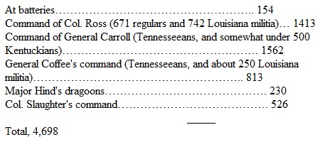 These figures tally almost exactly with those given by Major Latour, except that he omits all reference to Col. Slaughter's command, thus reducing the number to about 4,100. Nor can I anywhere find any allusion to Slaughter's command as taking part in the battle; and it is possible that these troops were the 500 Kentuckians ordered across the river by Jackson; in which case his whole force but slightly exceeded 5,000 men.
