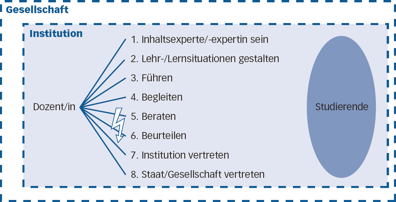 Die Komplexität des Rollenstrausses erhöht sich zudem durch die spezifischen Rollenerwartungen der Studierenden: Die einen erwarten von den Dozierenden reine Expertise, andere möchten klare Führung, wieder andere begnügen sich mit zurückhaltender Begleitung. Weitere verlangen immer wieder individuelle Beratung oder pochen auf klare Beurteilung, einige sehen die dozierende Person als Vertretung der Institution oder als Modell einer gesellschaftlich anerkannten Funktion.