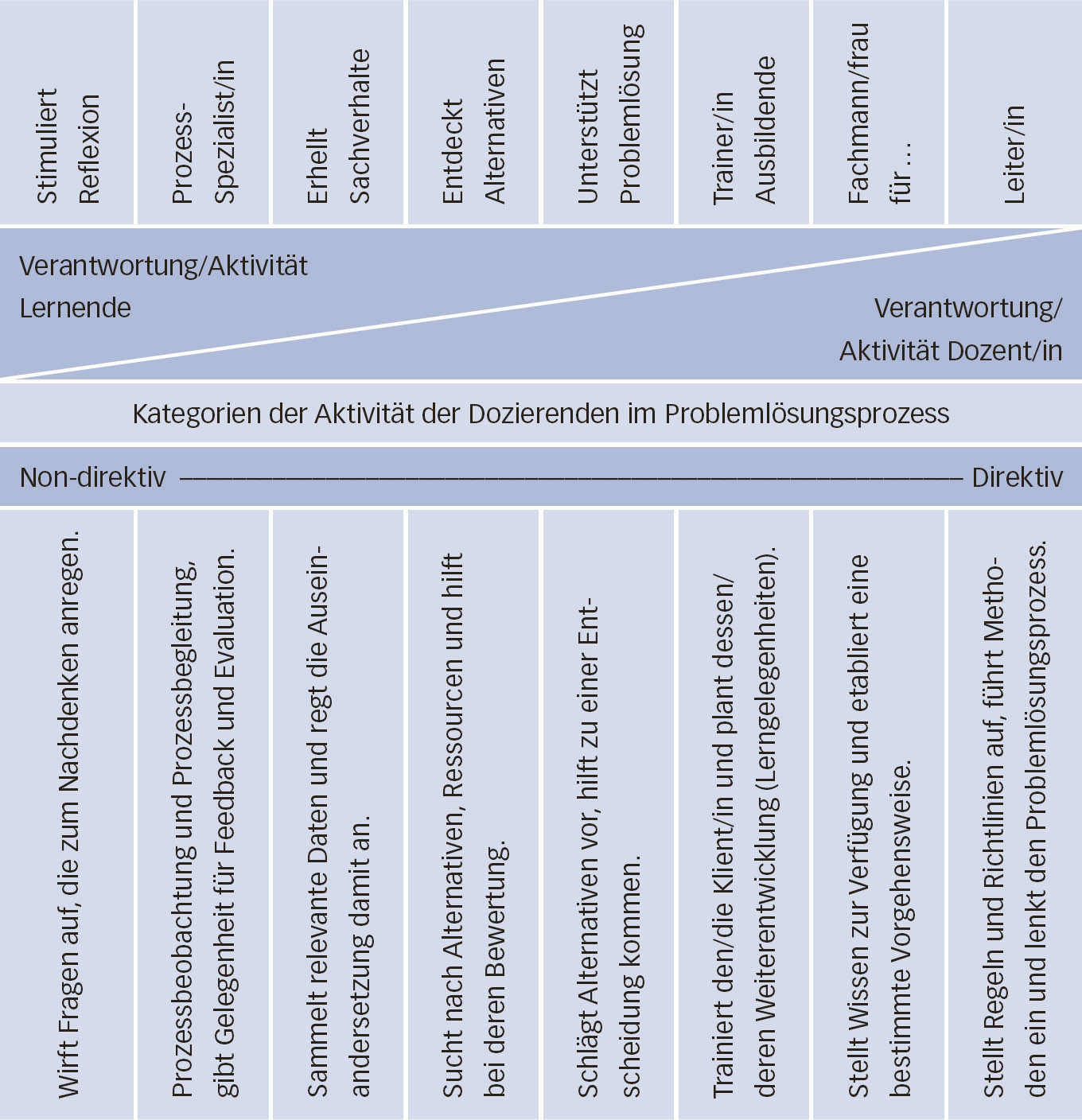 Diese Aufgaben beinhalten verschiedene direktive und non-direktive Interventionsformen, die flexibel und situationsadäquat eingesetzt werden. Es wird dabei deutlich, dass hier nicht nur Beratungs-, sondern auch Führungsund Beurteilungskompetenzen notwendig sind. Mit anderen Worten: Es geht dabei um eine flexible Rollengestaltung und um ein situationsgerechtes «Management» von Lernprozessen.