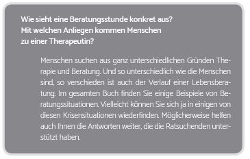 Weiter lesen Sie in diesem Buch einige Beispiele aus meiner therapeutischen Erfahrung, darüber, wie eine Lebensberatung aussehen kann, aus welchen Gründen Menschen zu mir gekommen sind und was ihnen geholfen hat, ihre Krise zu überwinden. Vielleicht finden Sie sich in diesen Beispielen wieder und Sie können an die Erfahrungen meiner Klientinnen und Klienten anknüpfen.