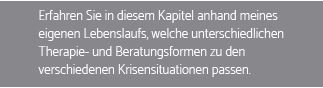 Mithilfe meiner eigenen Erfahrungen möchte ich Ihnen deutlich machen, dass unterschiedliche Formen von Beratung und Therapie im Leben unterstützen können, insbesondere dann, wenn man in kritischen Lebensphasen allein nicht weiterkommt.