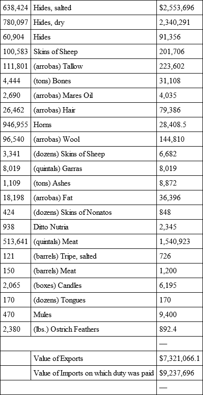 The consequence of the liberal commercial system adopted by Monte Video, aided by the excellence of its situation has been to raise that city, in fourteen years, to the position of one of the first commercial places in America, as will be seen from the following summary of the export and import trade in 1842, the year before the commencement of the siege: —