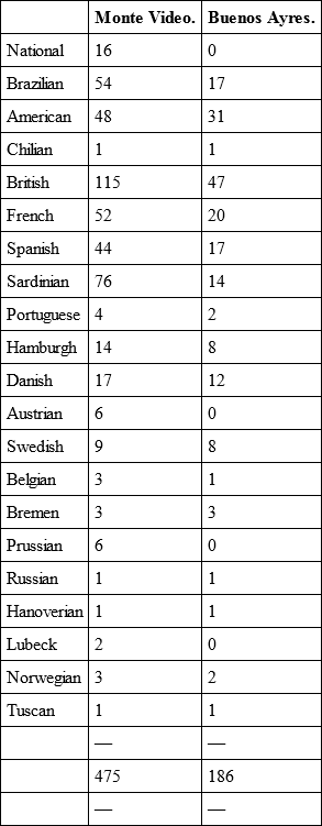 COMPARISON OF THE COMMERCE OF MONTE VIDEO AND BUENOS AYRESNumber of merchant vessels arrived at the Ports of Monte Video and Buenos Ayres during the half-year ending June 30th, 1842: —