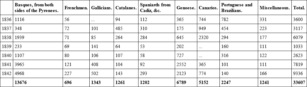 Table made from the books at the Sala de Comercio of the number of passengers who arrived at Monte Video from Nov. 1835 inclusive, to the end of 1842.