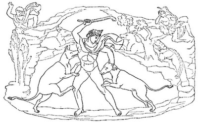 It is related that he loved Merope, the daughter of Œnopion, king of Chios, and sought her in marriage. He cleared the island of wild beasts and brought the spoils of the chase as presents to his beloved; but as Œnopion constantly deferred his consent, Orion attempted to gain possession of the maiden by violence. Her father, incensed at his conduct, made Orion drunk, deprived him of his sight, and cast him out on the seashore. The blinded hero, instructed by an oracle to seek the rays of morning, followed the sound of a Cyclops' hammer till he reached Lemnos, where Vulcan, taking pity on him, gave him Cedalion, one of his men, to be his guide to the abode of the sun. Placing Cedalion on his shoulders, Orion proceeded to the east, and there meeting the sun-god, was restored to sight by his beam.118