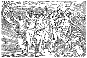 Sirius, his dog, follows him, and the Pleiads fly before him.119 In the beginning of winter, all through the night, Orion follows the chase across the heavens; but with dawn he sinks toward the waters of his father Neptune. In the beginning of summer, he may be seen with daybreak in the eastern sky, where, beloved by Aurora, he remains gradually paling before the light of day till, finally, Diana, jealous of his happiness, draws her gentle darts and slays him.