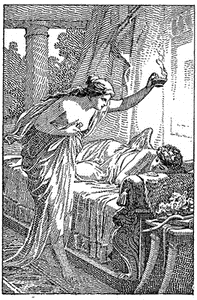 These persuasions Psyche resisted as well as she could, but they did not fail to have their effect on her mind. She prepared a lamp and a sharp knife, and hid them out of sight of her husband. That night, when he had fallen into his first sleep, she silently rose and uncovering her lamp —