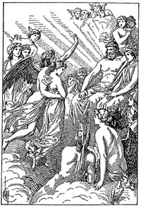 Then Cupid, swift as lightning penetrating the heights of heaven, presented himself before Jupiter with his supplication. Jupiter lent a favoring ear and pleaded the cause of the lovers with Venus. Gaining her consent, he ordered Mercury to convey Psyche to the heavenly abodes. On her advent, the king of the immortals, handing her a cup of ambrosia, said, "Drink this, Psyche, and be immortal. Thy Cupid shall never break from the knot in which he is tied; these nuptials shall indeed be perpetual."